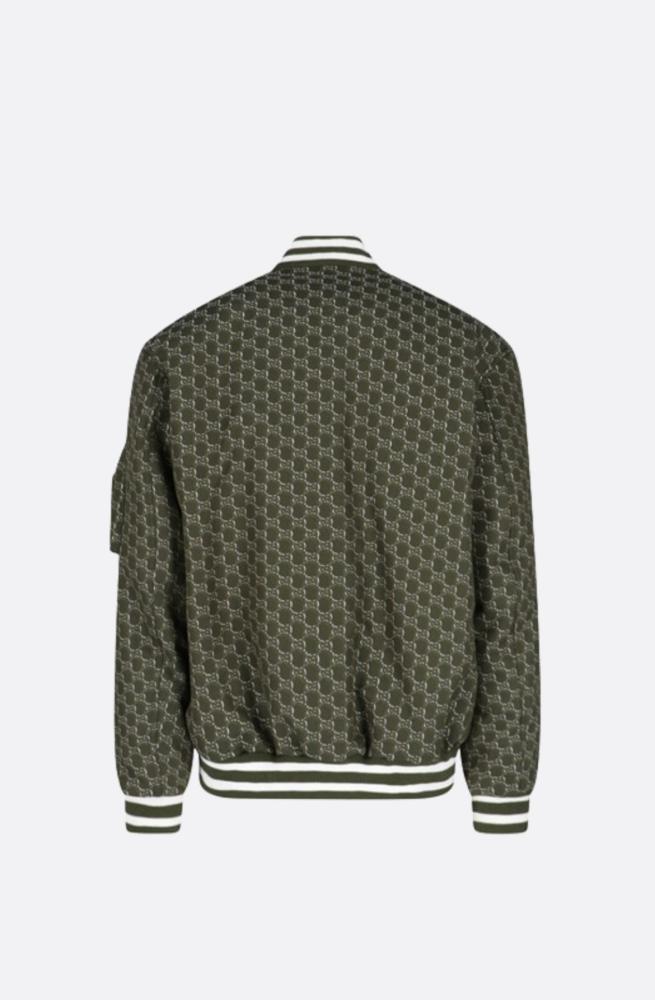 هذا جاكيت بومبر بنقشة مونوغرام متكررة بلون داكن، على الأرجح أخضر داكن أو زيتي، مع لمعان خفيف. يبدو أن المونوغرام هو شعار "G" أو "GG" بشكل منمق.