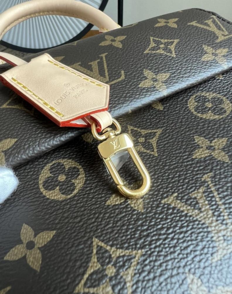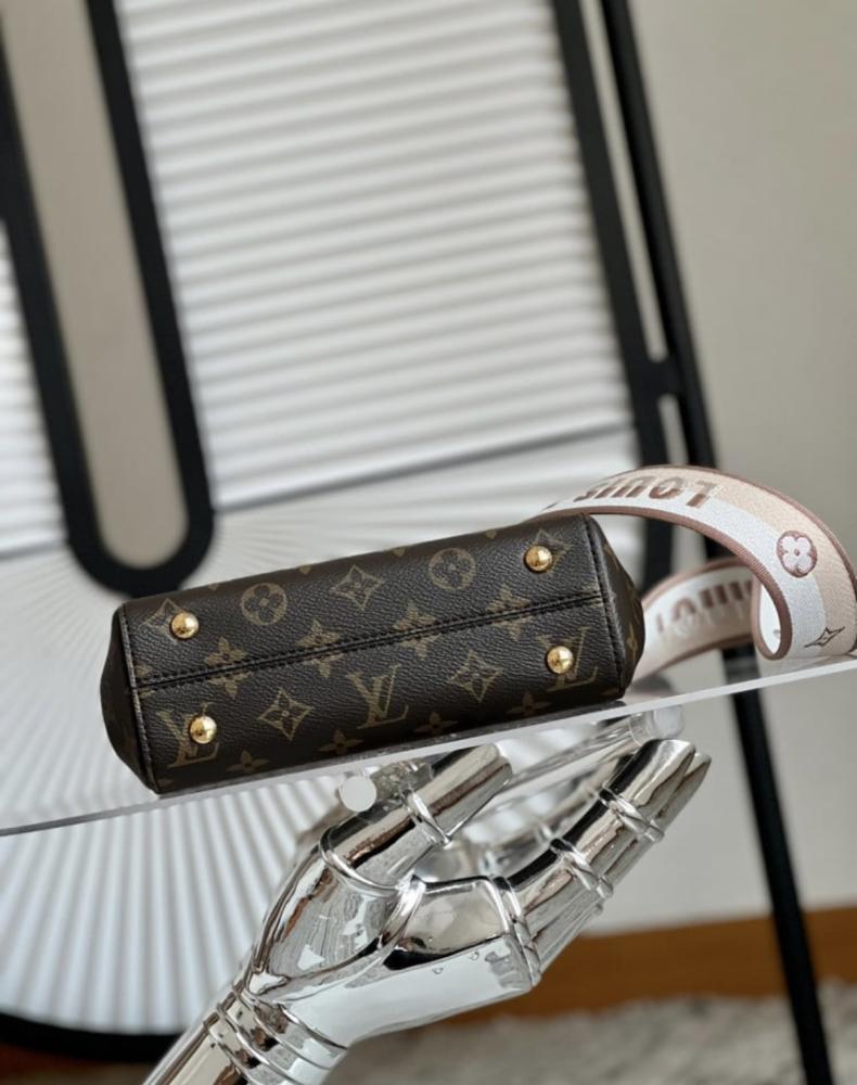 تتميز الحقيبة بتصميمها الكلاسيكي من قماش Monogram Canvas البني مع شعار LV والزهور. تحتوي على مقبض علوي واحد من الجلد الطبيعي باللون البيج الفاتح (Vachetta leather)، وهو لون مميز لمنتجات لويس فويتون.