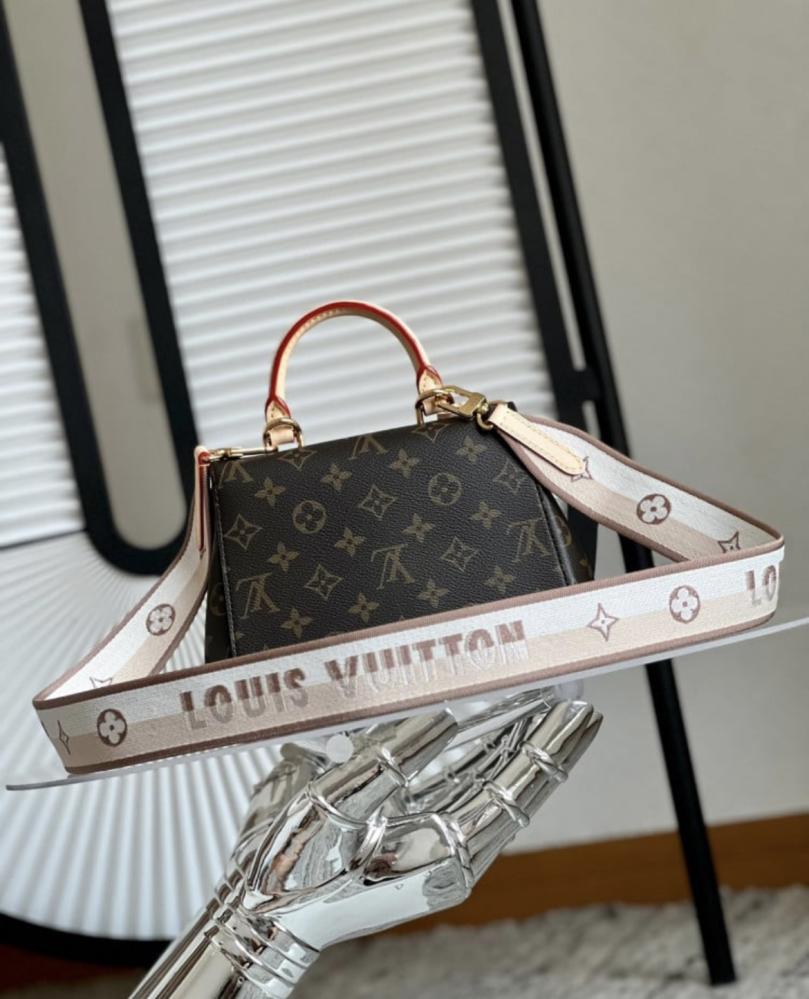 تتميز الحقيبة بغطاء علوي يتم إغلاقه بمشبك. يأتي مع الحقيبة حزام كتف عريض وقابل للفصل، مطبوع عليه اسم "Louis Vuitton"، مما يسمح بحملها بطرق مختلفة مثل حقيبة كتف أو كروسبودي.
