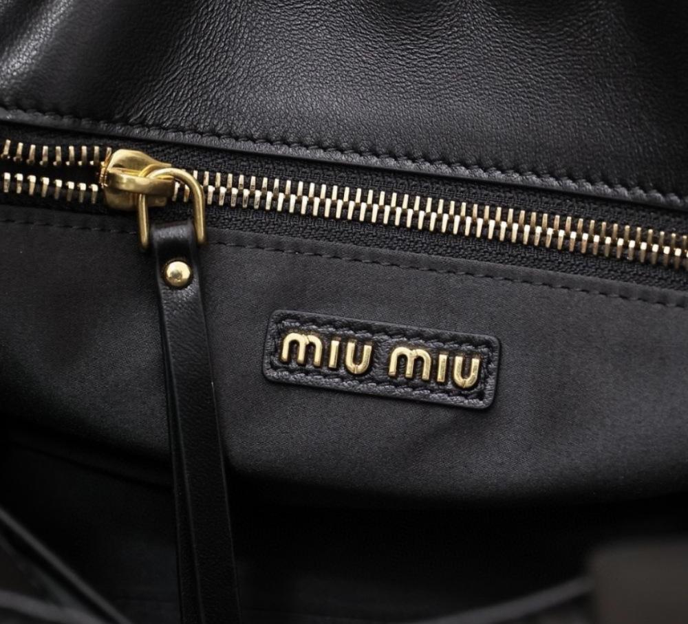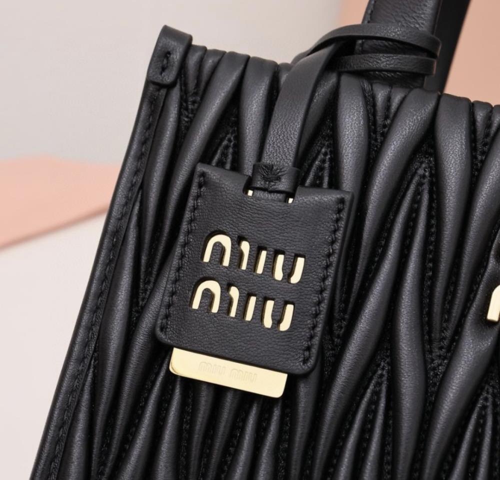 * الشعار: شعار Miu Miu الذهبي اللامع مثبت في منتصف الواجهة الأمامية للحقيبة. كما يوجد شعار آخر على ميدالية جلدية متدلية من أحد المقبضين.