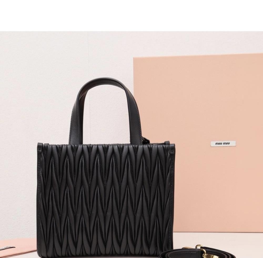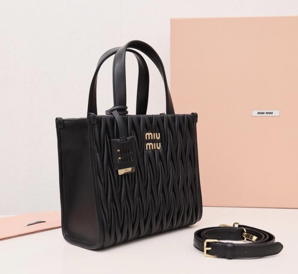 * الخامة والتصميم: مصنوعة من جلد أسود ناعم ومبطّن بنمط مميز على شكل خطوط متعرجة (Matelassé)، وهو تصميم أيقوني لعلامة Miu Miu.